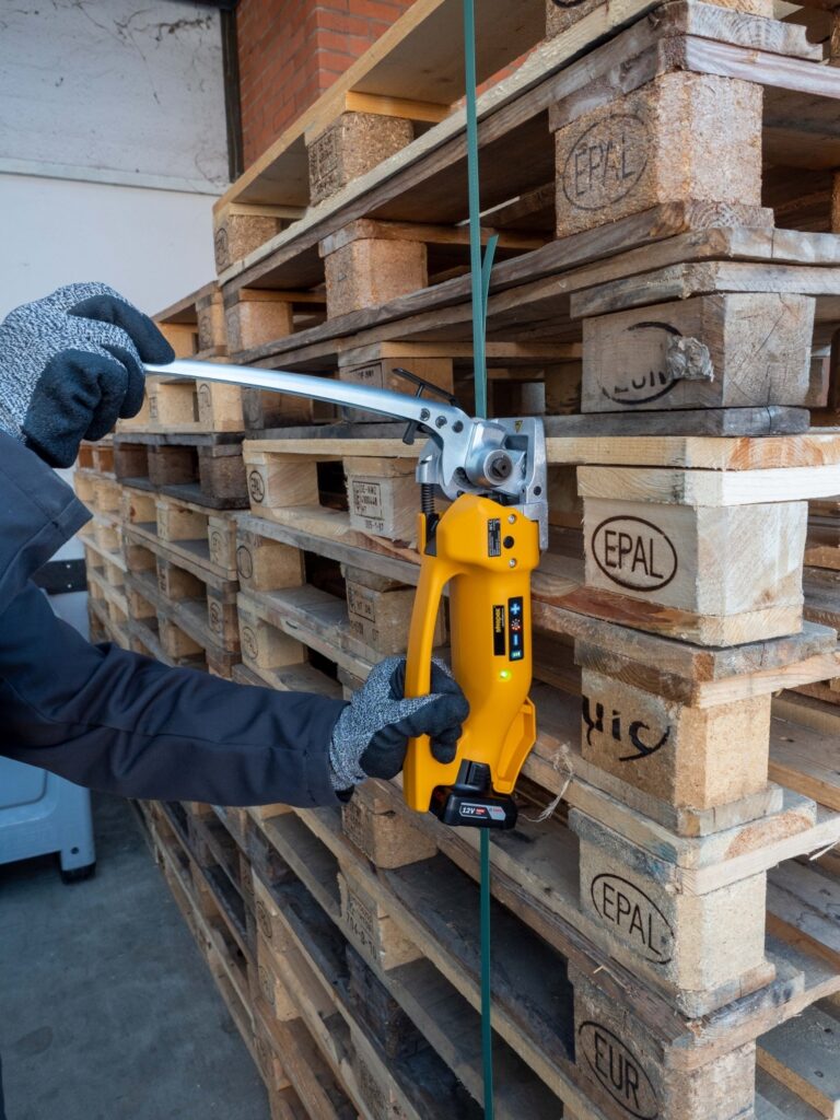 Ekonomický akumulátorový páskovací strojek pro spojování polypropylenových vázacích pásek a polyesterových vázacích pásek. Vázací pásku napíná obsluha pomocí páky, která pomocí převodů vnáší do pásky tah. Páskovačka pomocí třecího mechanismu poháněného akumulátorem pásku spojí svárem. Páskovací strojek je vyvážený, jednoduchý a lehký. Zavádění pásky je z levé strany a páska se zavádí do páskovačky do dělené vodící drážky.